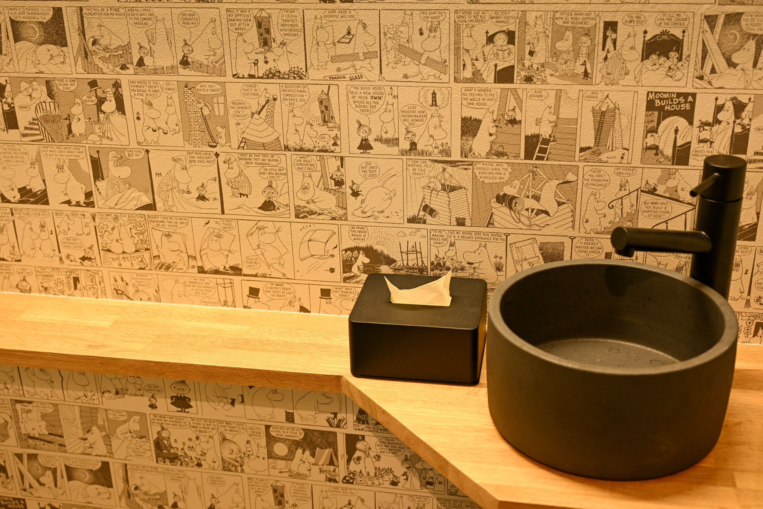 化粧室はちょっとした遊びのあるクロスを採用し、小さな手洗い場を作成。